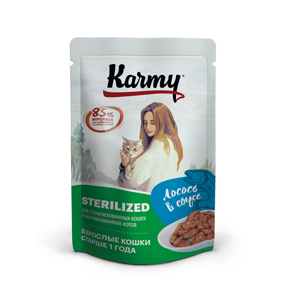*KARMY влажный корм для кошек и котов от 1 года, для стерилизованных и кастрированных лосось в соусе 80г