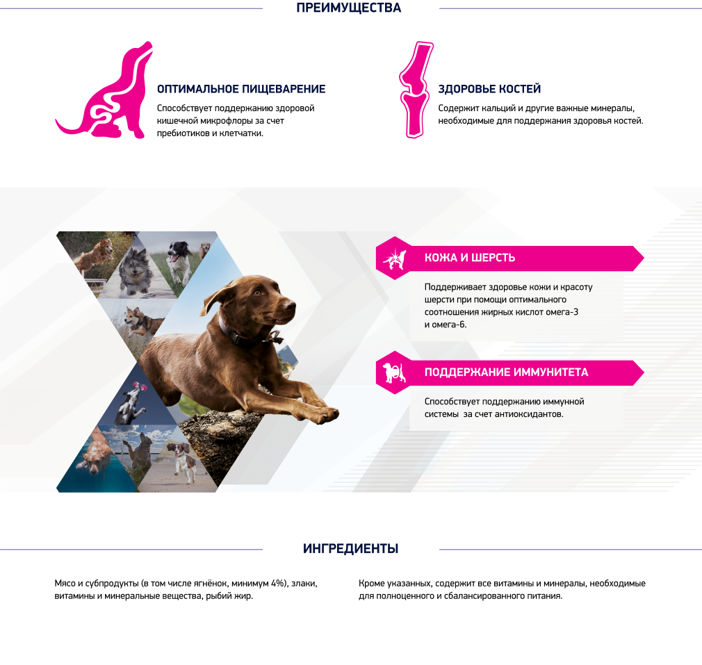 Мясо и субпродукты (в том числе ягнёнок, минимум 4%), злаки, витамины и минеральные вещества, рыбий жир.