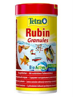 TetraRubin Granulat –Гранулированный корм для усиления естественной окраски. Гранулированный состав корма с натуральными пищевыми добавками обеспечивает усиление окраса рыбок. В составе гранул содержится натуральное сырье без гормональных элементов, что обеспечивает насыщенный цвет окраске рыбок. Результат от кормления кормом заметен через две недели. Гранулы содержат витаминный и минеральный комплексы, питательные вещества, а также стабилизированный витамин С, который повышает иммунитет особей, защищает организм рыб от болезней и ускоряет процесс роста.