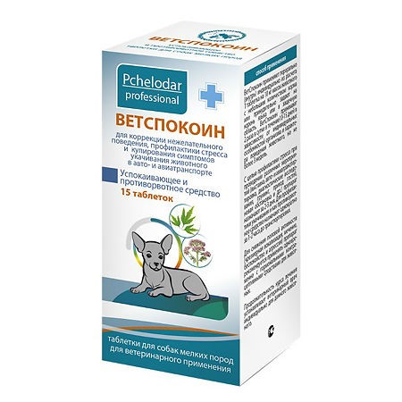 Ветспокоин — эффективное успокаивающее и противорвотное средство для животных на основе фенибута, прометазина, экстрактов пустырника, валерианы и натурального пчелиного маточного молочка. Активные действующие вещества усиливают друг друга и оказывают мягкое седативное, противорвотное, спазмалитическое, стрессопротекторное и адаптогенное действие. Ветспокоин помогает нормализовать поведение животного (снизить агрессивность, повышенную боязливость), снять симптомы укачивания в транспорте (рвота, саливация, беспокойство и тд.), снизить проявления стресса и наладить межвидовые отношения. Натуральное маточное молочко содержит в своем составе витамины группы В, минеральные вещества, аминокислоты, ферменты и оказывает восстанавливающее и нормализующее действие на нервную, гормональную и эндокринную систему животного.
