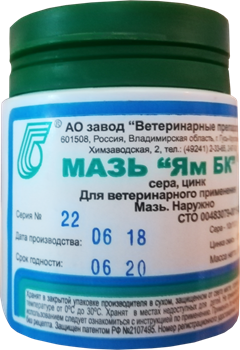 Мазь «Ям БК»® применяют для лечения животных при экземе, дерматитах, вызванных саркоптоидными и псороптоидными клещами, а также трихофитии.