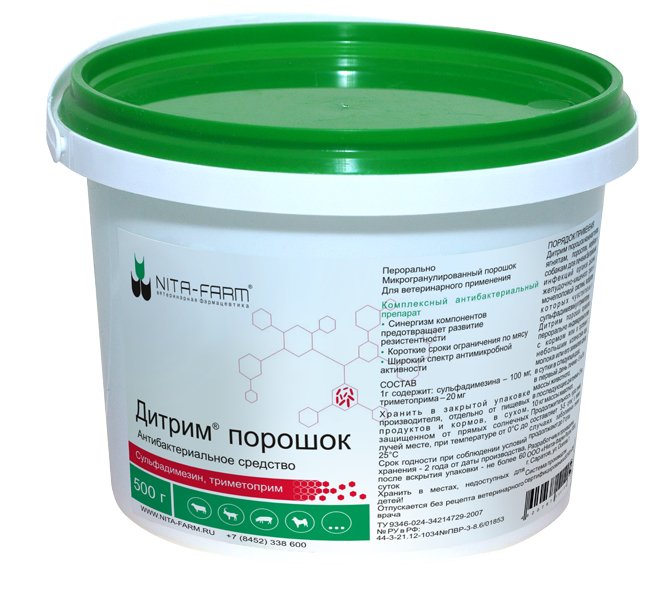 Сульфадимезин и триметоприм, входящие в состав препарата, проявляют синергизм действия, т. е. усиливают действие друг друга путем последовательного воздействия на метаболизм n-аминобензойной и фолиевой кислот в микробной клетке. Взаимодействие этих компонентов способствует расширению антибактериального спектра действия препарата. Спектр действия препарата охватывает грамположительные и грамотрицательные микроорганизмы, в т. ч. E. coli, Clostridium spp., Salmonella spp., Proteus spp., Bacillus anthracis, Pasteurella spp., Haemophilus spp., Vibrio spp., Staphylococcus spp., Streptococcus spp., Shigella spp., Corynebacterium spp., Klebsiella spp., Fusobacterium spp., Bordetella spp., Brucella spp.). После перорального применения дитрим порошок быстро всасывается в желудочно-кишечном тракте и проникает в органы и ткани организма животного, достигая максимальной концентрации через 2 – 3 часа после введения. Антибактериальное действие поддерживается в течение суток. Дитрим порошок по степени воздействия на организм теплокровных животных относится к умеренно опасным веществам, в рекомендуемых дозах не оказывает сенсибилизирующего, эмбриотоксического, тератогенного и мутагенного действия. Выводится из организма преимущественно с мочой и фекалиями.